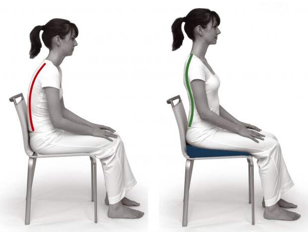 Держать свое тело в положении сидя, как и в положении стоя, тоже нужно прямо. Подобную привычку достаточно просто выработать. Для этого на некоторое время нужно отказаться от табуреток и мягкой мебели. Сидеть нужно на твёрдых стульчиках со спинкой, которая в идеале повторяет линию позвоночника. Кроме этого, нужно избавиться от привычки закидывать ногу на ногу, если она вам присуща. Это крайне вредная привычка, в частности для кровеносной системы. К тому же, она вполне способна привести к заболеваниям органов малого таза и мочевыделительной системы из-за постоянного сдавливания нервных окончаний и кровеносных сосудов.